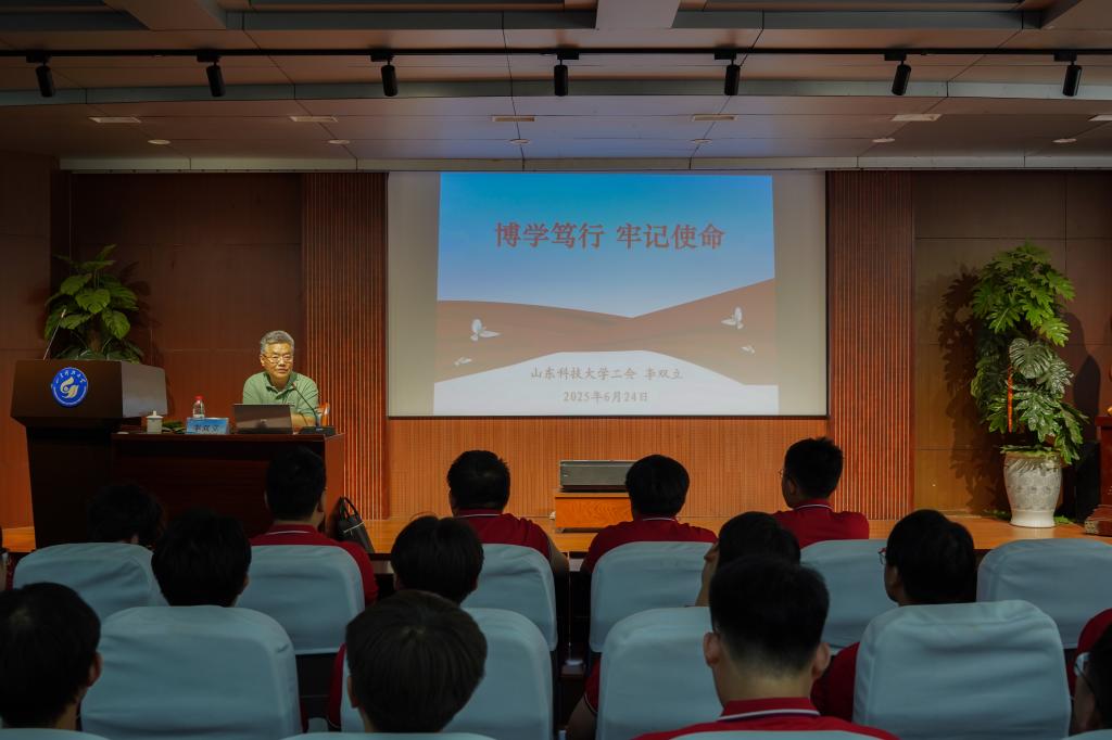 党课中,李双立以山东科技大学74年发展历程为经,以中国共产党百年奋斗史为纬,以澳门电子pg游戏官网成长轨迹为线,为毕业生党员铺展了一幅“校史-党史-院史”交织的壮阔画卷。他深情回顾了学校从1951年建校至今的峥嵘岁月,从淄博洪山的初创岁月到济南、泰安的扎根发展,再到青岛校区的跨越腾飞,生动诠释了“惟真求新”校训的时代内涵与精神传承。谈及学校在分合搬迁中淬炼出的“坚韧不拔、发奋图强”精神品格,以及在多校合并中凝聚的“爱校奉献、敬业实干”文化传统时,他的讲述中饱含深情:“这些基因密码,是每一位科大人最珍贵的‘精神原乡’。”