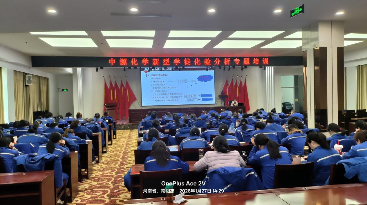 为深入推进河南省第二批高水平高等职业学校和高水平专业群(以下简称“双高建设”)建设工程(2025-2029年),深化现代学徒制改革,精准对接区域产业发展需求,落实产教融合、科教融汇核心要求,2026年1月25日至29日,学院选派吴朝阳、黄爱平两位骨干教师走进河南中源化学股份有限公司,开展首批化学检验工现代学徒制专题培训。本次培训分两批开展,紧扣企业生产实际与岗位技能要求,系统提升学员理论知识与操作规范,既是学校推动产教融合、主动对接行业需求的务实举措,更是以双高建设为引领、赋能地方产业高质量发展的具体实践。