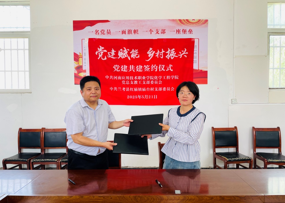 活动结束后,中共bat365正版唯一官网化学工程学院党总支教工支部委员会与中共兰考县红庙镇庙台村党支部委员会签订《乡村振兴技术帮扶协议》,推动专业与产业对接、教学过程与生产过程对接,在党建赋能乡村振兴的同时,进一步提升应用化工技术高水平专业群建设。化学工程学院党总支书记陈永惠、党总支副书记常惟诚、副院长岳瑞丰,协管员范雨欣及驻村第一书记任旭凯、队员李盈、陈开友等共同参与签约活动。