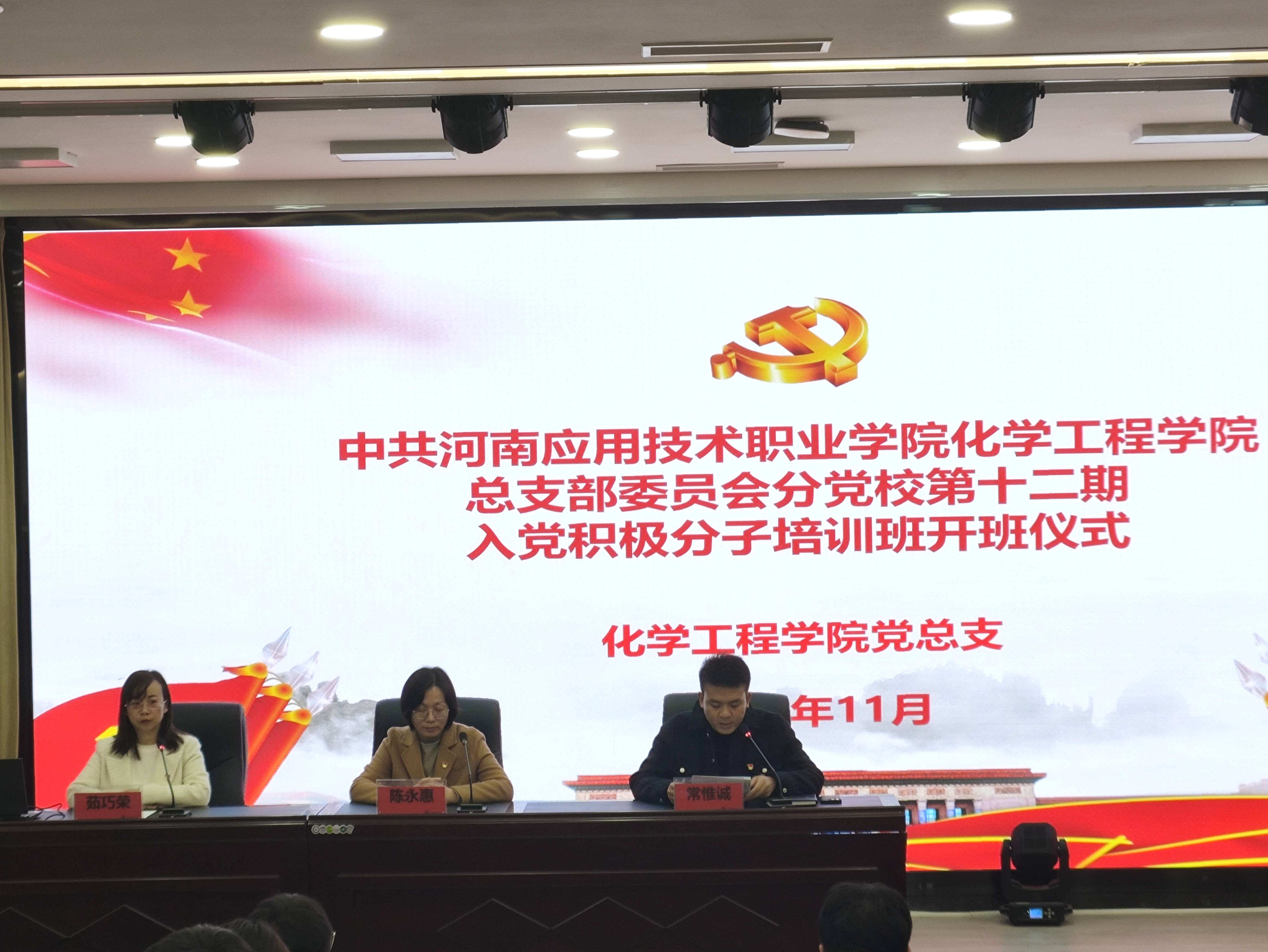为深入学习贯彻习近平总书记关于党的建设的重要论述,进一步加强学生党员队伍建设,夯实入党积极分子的思想政治基础。2024年11月16日,化学工程学院党总支在郑州校区B楼学术报告厅举行第十二期入党积极分子培训班开班仪式。开班仪式由学工支部第三小组组长茹巧荣主持,学院党总支书记陈永惠,学院党总支副书记常惟诚出席开班仪式。