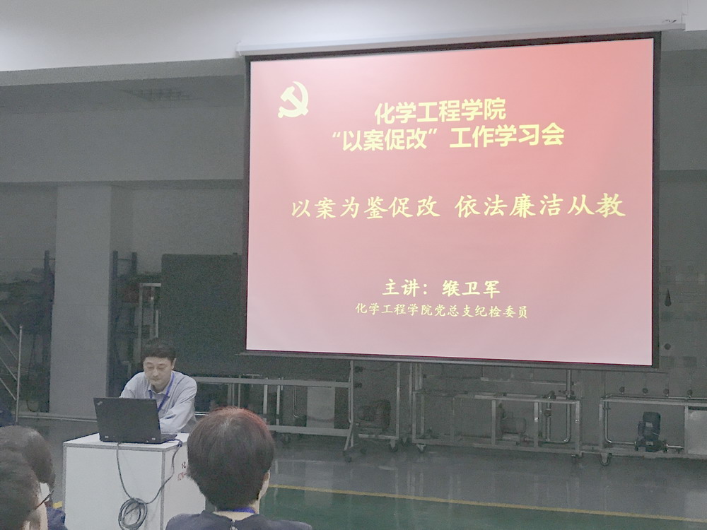 2017年9月7日,化学工程学院党总支在E2实训室,召开全体大会,参加纪委委员缑卫军老师“以案为鉴促改 依法廉洁从教”的党课学习。缑卫军老师列举六个违纪违法典型案例,深刻剖析案件发生的原因,告诫老师们应该守牢岗位底线、不越岗位红线,必须做到加强学习,构筑拒腐防变的思想防线;立足本职,坚定理想信念,提高自我警省能力,经受住各种考验,抵御住各种诱惑,才能立于不败之地;以案为鉴,自律自重,鉴照自己的行为,做到自警、自省、自重、自律,做学生的表率。朱冰书记做了总结发言,希望全体同志能以此次党课学习为契机,思考个人工作过程中关于廉洁自律问题的表现,要做重视且明白的自律者,不要做不重视且不知道的糊涂者。