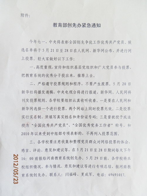 接到组织人事处《关于转发“省教育系统创先办紧急通知”的通知》,现转发给大家,请认真阅读,积极参与。