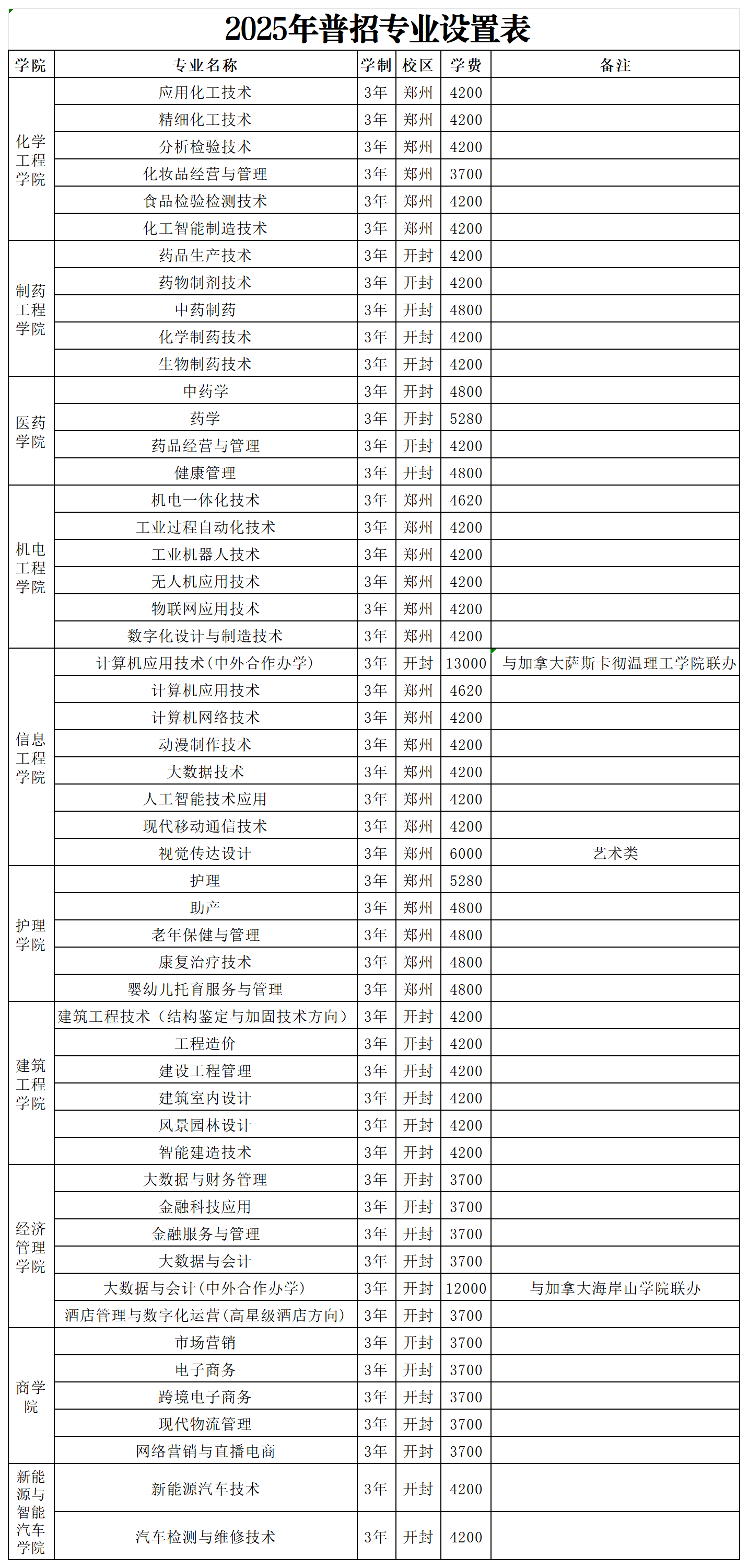 开封校区:药品生产技术、药物制剂技术、中药制药、化学制药技术、生物制药技术、中药学、药学、药品经营与管理、健康管理、新能源汽车技术、汽车检测与维修技术、建筑工程技术(结构鉴定与加固技术)、工程造价、建设工程管理、建筑室内设计、风景园林设计、智能建造技术、市场营销、电子商务、跨境电子商务、现代物流管理、网络营销与直播电商、大数据与财务管理、金融科技应用、金融服务与管理、大数据与会计、酒店管理与数字化运营(高星级酒店方向)、大数据与会计(中外合作办学)、计算机应用技术(中外合作办学)。